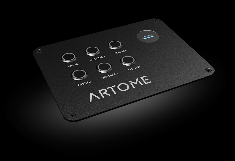 The embedded 2.1 sound system offers an easy-to-use audio to meet the versatile needs of different spaces. In addition, for larger experience Artome can be connected to external speakers.
