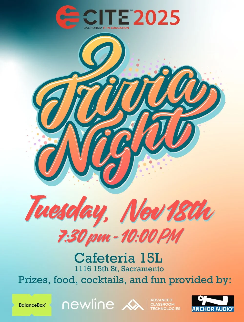 Tuesday Night, Nov 18th7:30 PM - 10:00 PM Exclusively for CITE 2023 attendees. Open Bar / Great Food / Amazing Prizes 1116 15th St. SacramentoRight behind the Convention Center. Sold Out Sorry folks, but we have run out of space at the venue so we had to shut down the RSVP link. Feel free to drop in, but we can’t promise that you will be able to play.